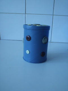 Material: Uma caixa de batatas pringles, pintada com tinta azul metálica e decorada com botões, que foram colados. A Tampa é de plástico e era de uma lata de bolas de ténis. O centro desta foi coberto com cartão e toda a tampa pintada com tinta azul acetinada e decorada com botões que foram colados.